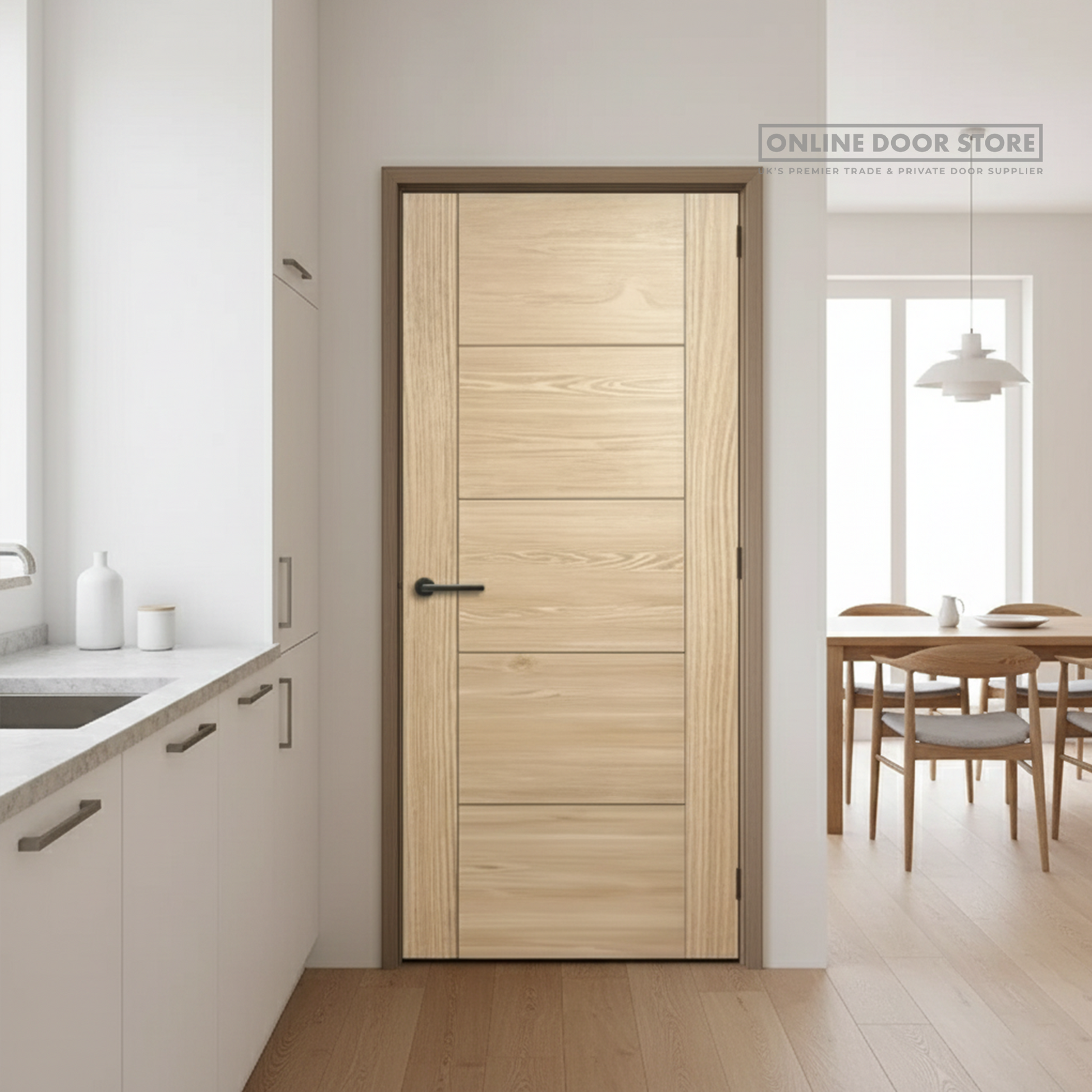 The Aster Horizontal Five Panel V-Groove Unfinished Oak FD30 Fire Door features a sleek modern design, characterised by five horizontal grooves bordered by vertical panels. This door is suitable for various internal spaces including dining rooms, living rooms, kitchens, bedrooms, and bathrooms, as well as commercial applications such as corridors and offices.