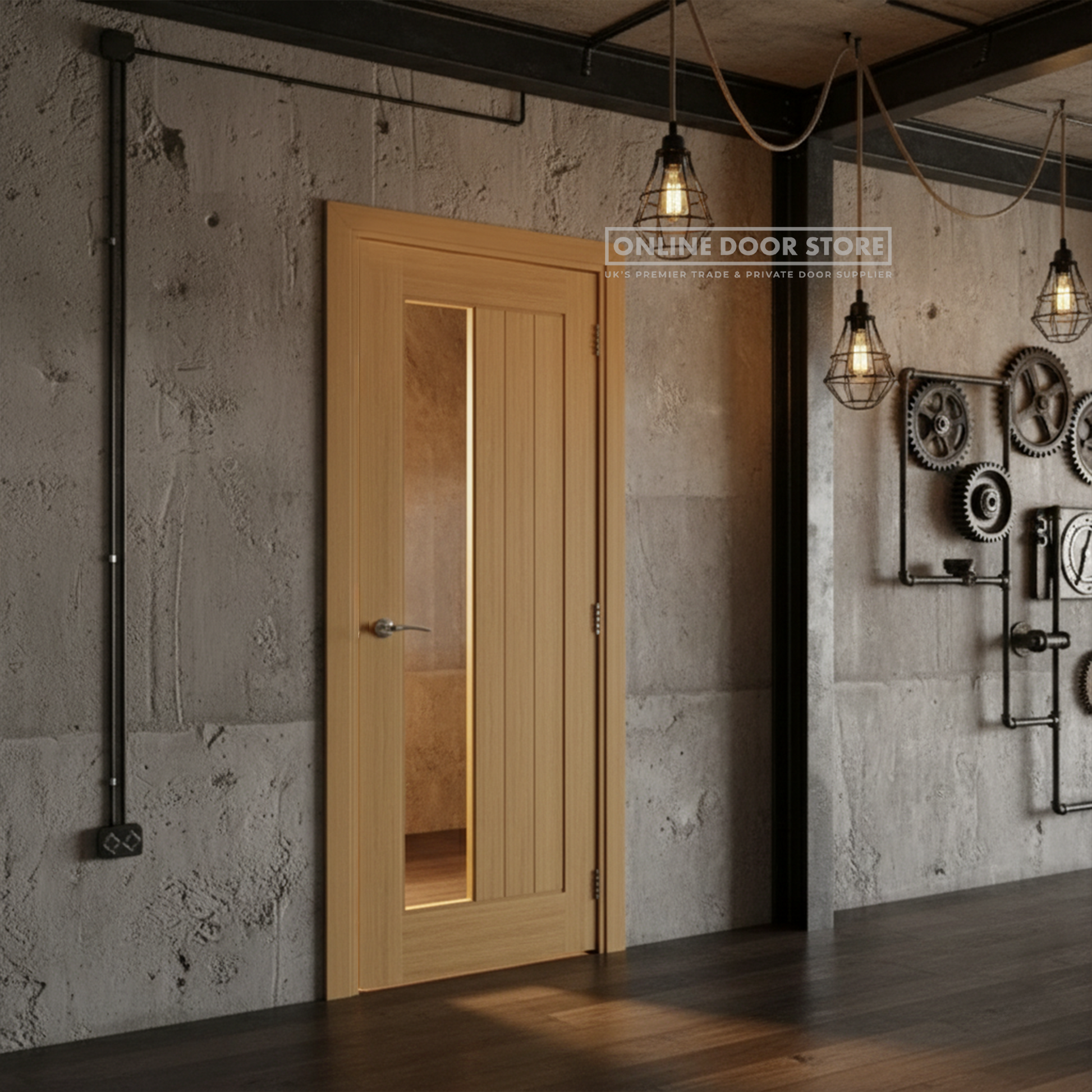 Deanta Ely Prefinished Oak Internal Glazed Door (1L Full) features a modern shaker-style design with a full-length clear tempered glass panel, making it perfect for enhancing light transfer in dining rooms and commercial spaces. Crafted from real American white oak veneer, it is pre-finished for immediate use and comes with a 10-year manufacturer's warranty.