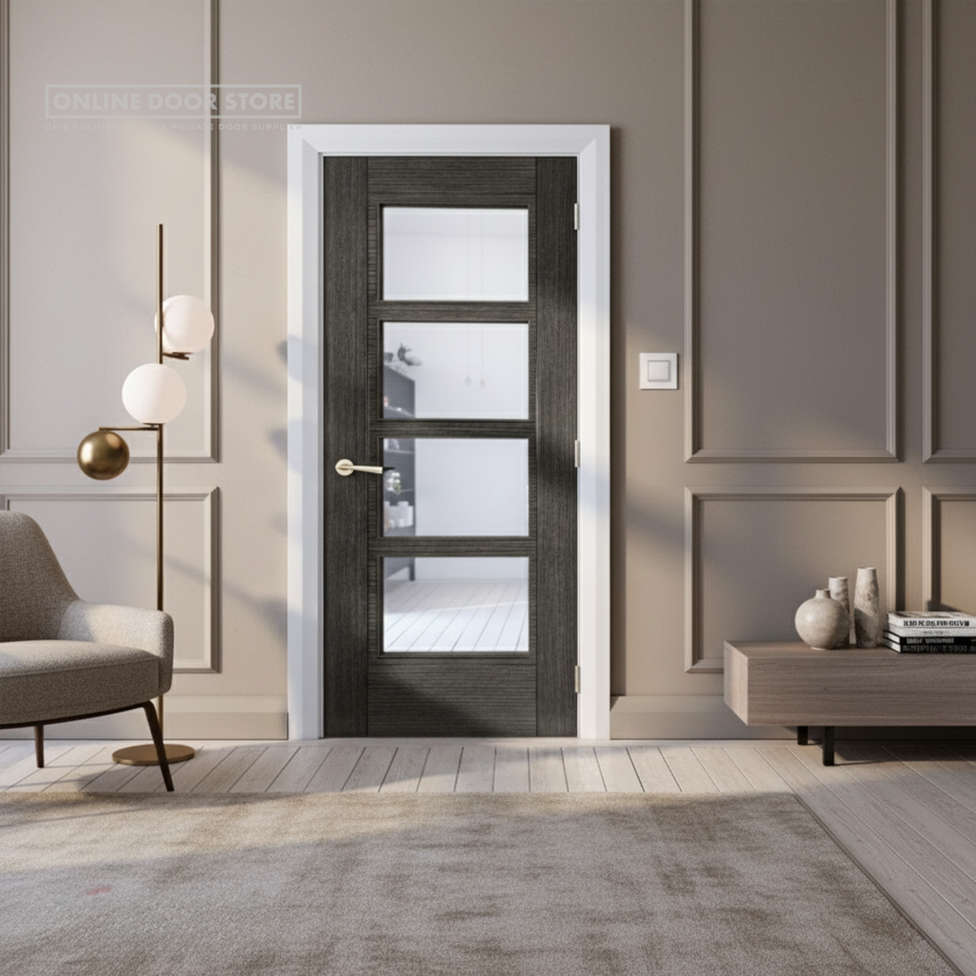 Deanta Montreal Dark Grey Ash Glazed FD30 Fire Door features a contemporary design with a certified 30-minute fire safety rating and four vision panels, making it suitable for both residential and commercial use. Its dark grey ash veneer and engineered solid core construction provide both style and functionality, and it is pre-finished and ready to hang.