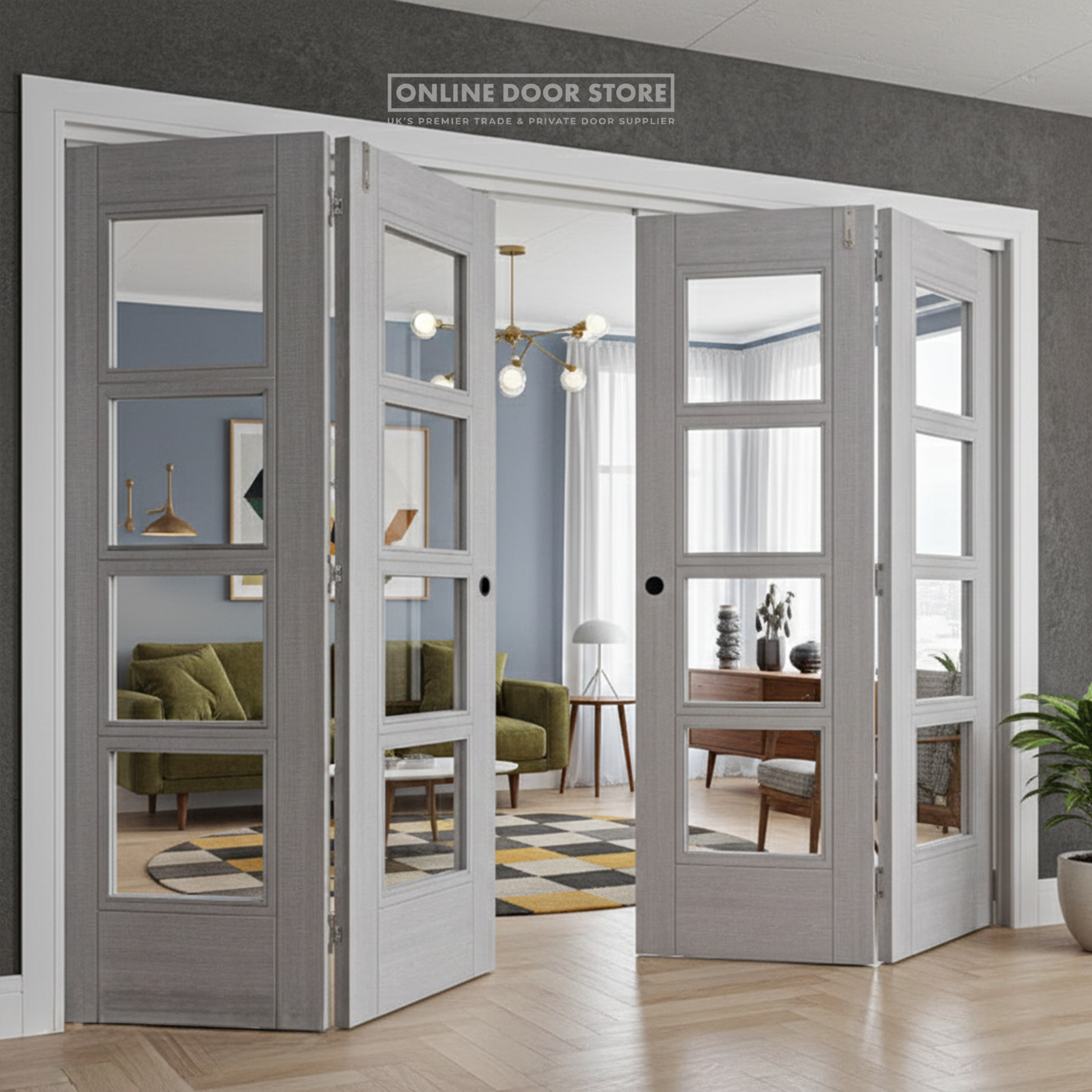 Deanta Montreal Dark Grey Ash Internal Glazed Door features a sleek, contemporary design with four clear glazed panels, perfect for modern homes and commercial spaces. This prefinished door is available in multiple sizes and can easily be trimmed for unique openings, while also offering bespoke options.