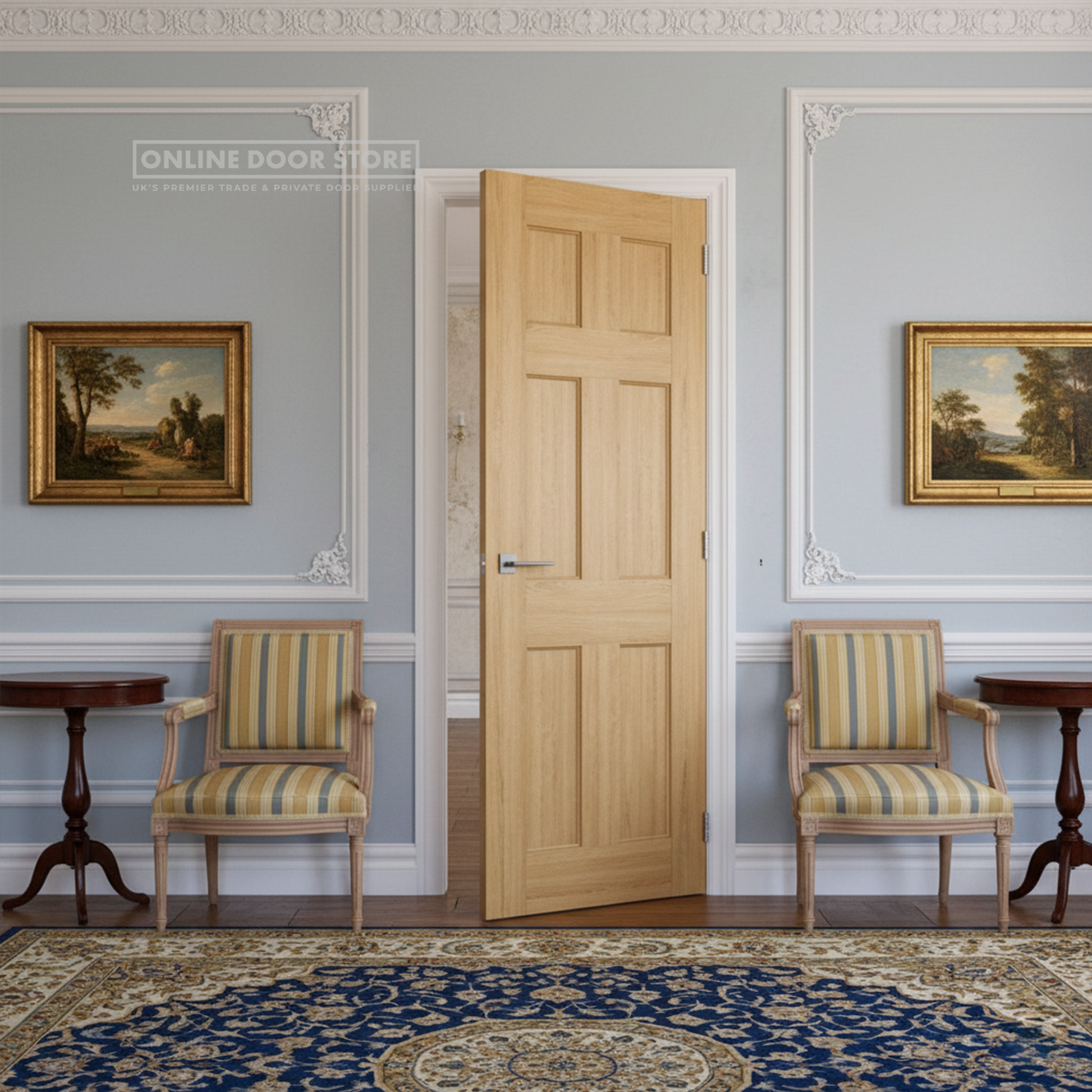 Elevate your home with the Deanta Oxford Prefinished Oak Internal Door, featuring six raised panels and a fire door option for timeless elegance.