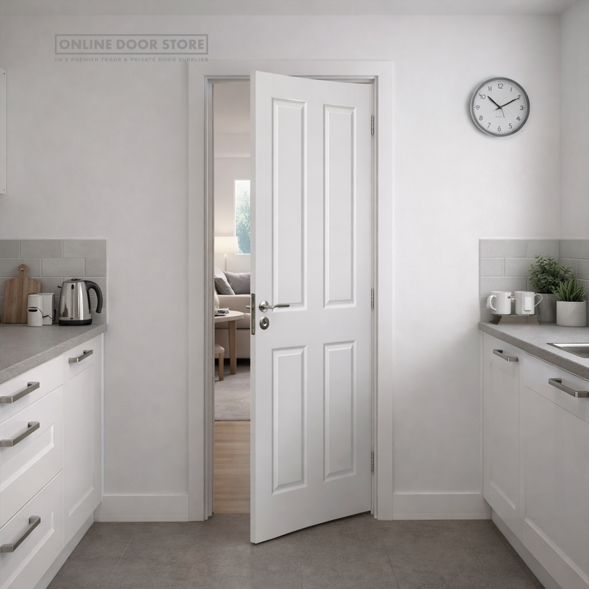 JB Kind Canterbury Smooth Internal Door is a primed white moulded panel door featuring a smooth effect and standard core construction, suitable for pocket door systems. It comes with a 15-year manufacturer's defect guarantee and is available in multiple sizes.