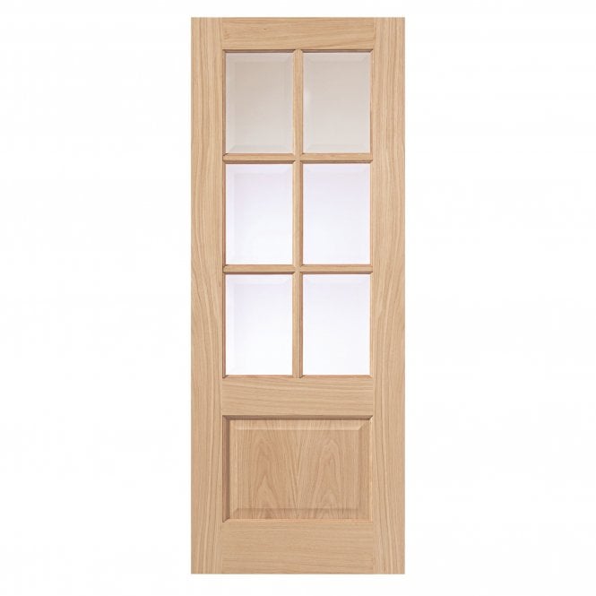 JB Kind Dove Oak Finished Internal Glazed Door features a classic real oak veneer design with six clear bevelled safety glass panels, making it customizable for your decor. This solid core door is supplied unfinished, ready for staining or varnishing, and is supported by a 15-year manufacturer's defect guarantee.