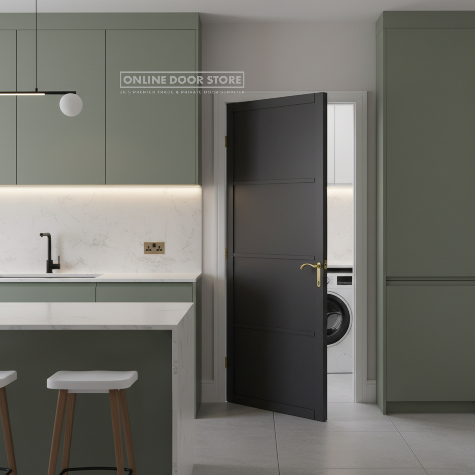 The LPD Black Soho 4-Panel Internal Door features modernist styling with unique beadings that create a distinctive cubist pattern. Perfect for a variety of internal areas including dining rooms, living rooms, kitchens, and commercial applications such as corridors and offices.