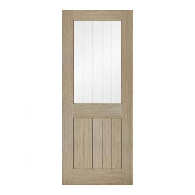 - Glazed Panel Clear glass with frosted lines enhances light while maintaining privacy.