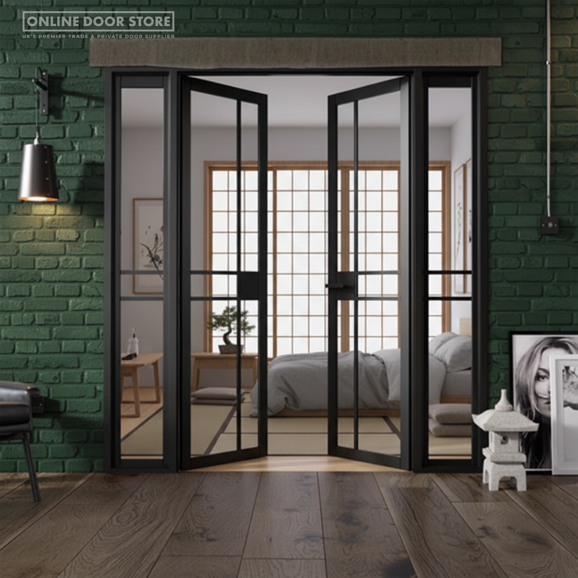 LPD Room Divider Black Greenwich W8 Internal Glazed Doorset is an 8-foot wide room divider set featuring fully glazed Art Deco style doors with clear glass, ideal for both residential and commercial spaces. The product boasts a high-end primed black finish and comes pre-finished, ready to hang right away.