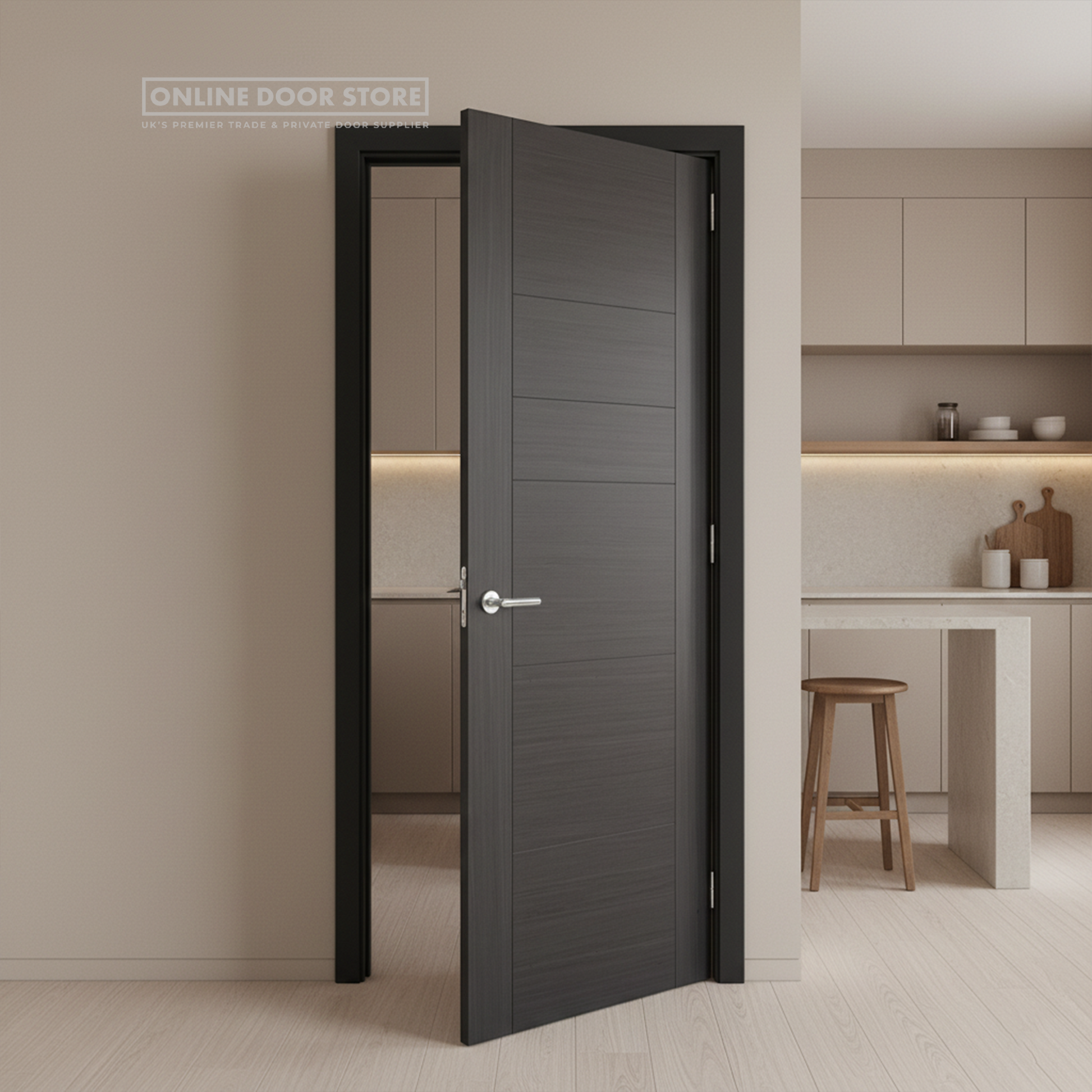 LPD Light Grey Vancouver 5P FD30 Fire Door features a sleek modern design with a light grey veneer and five horizontal panels, making it suitable for various internal areas, including dining rooms and garages. This pre-finished door is FD30 rated for fire safety, offering a 30-minute protection and is backed by a 10-year manufacturer's warranty.