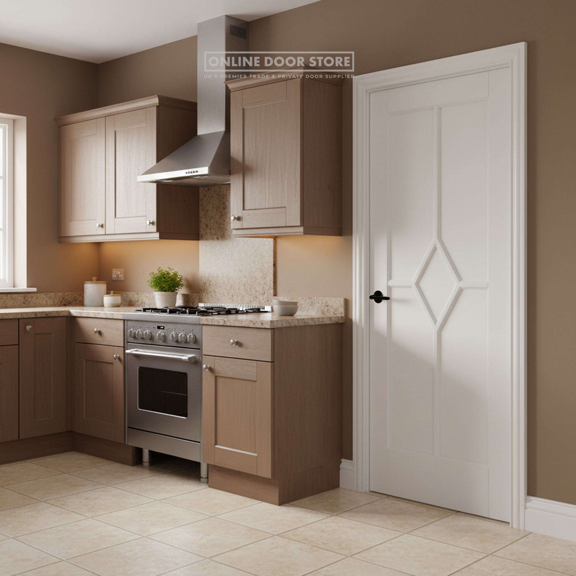 The LPD White Reims FD30 Fire Door combines traditional styling with practical fire safety features, making it suitable for various internal spaces, including dining rooms, living rooms, kitchens, and offices. With its bold accent mouldings and diamond design, it adds an elegant touch while ensuring robust performance in commercial applications.