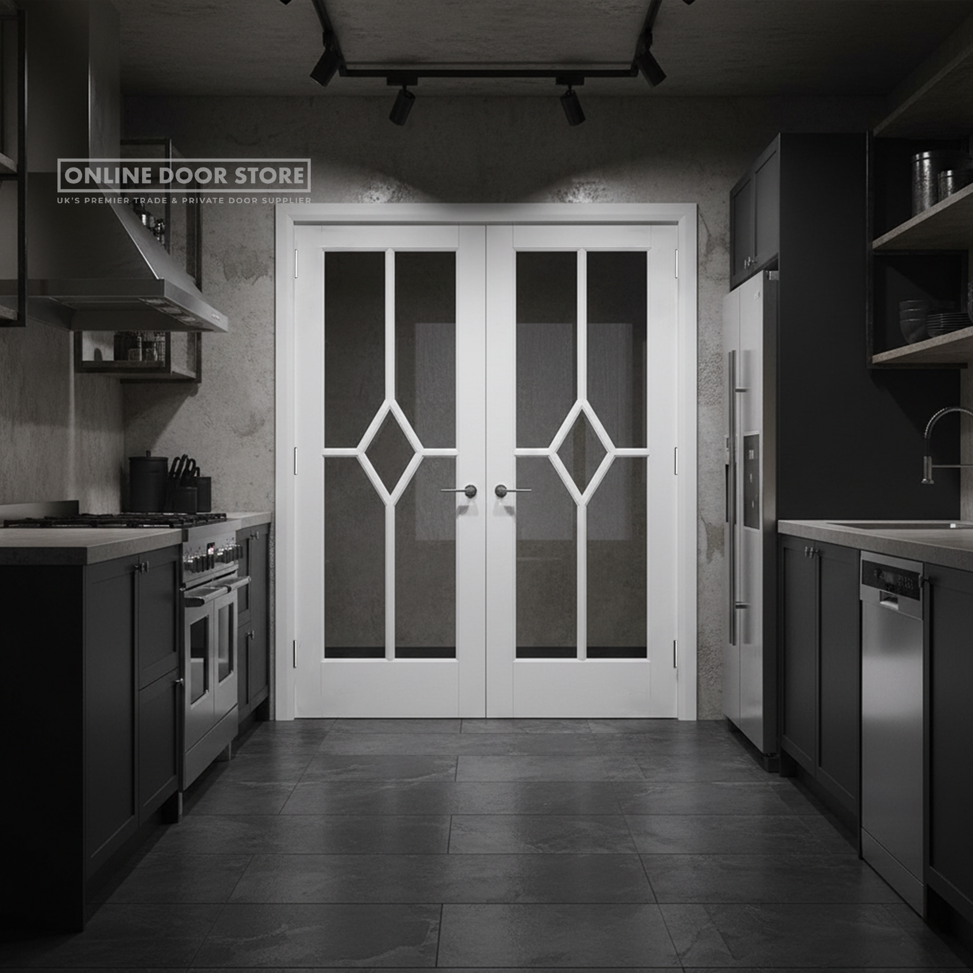 Create an airy feel and transform your space with the LPD White Reims Internal Glazed Door Pair, featuring a diamond-shaped design, clear bevelled glass.