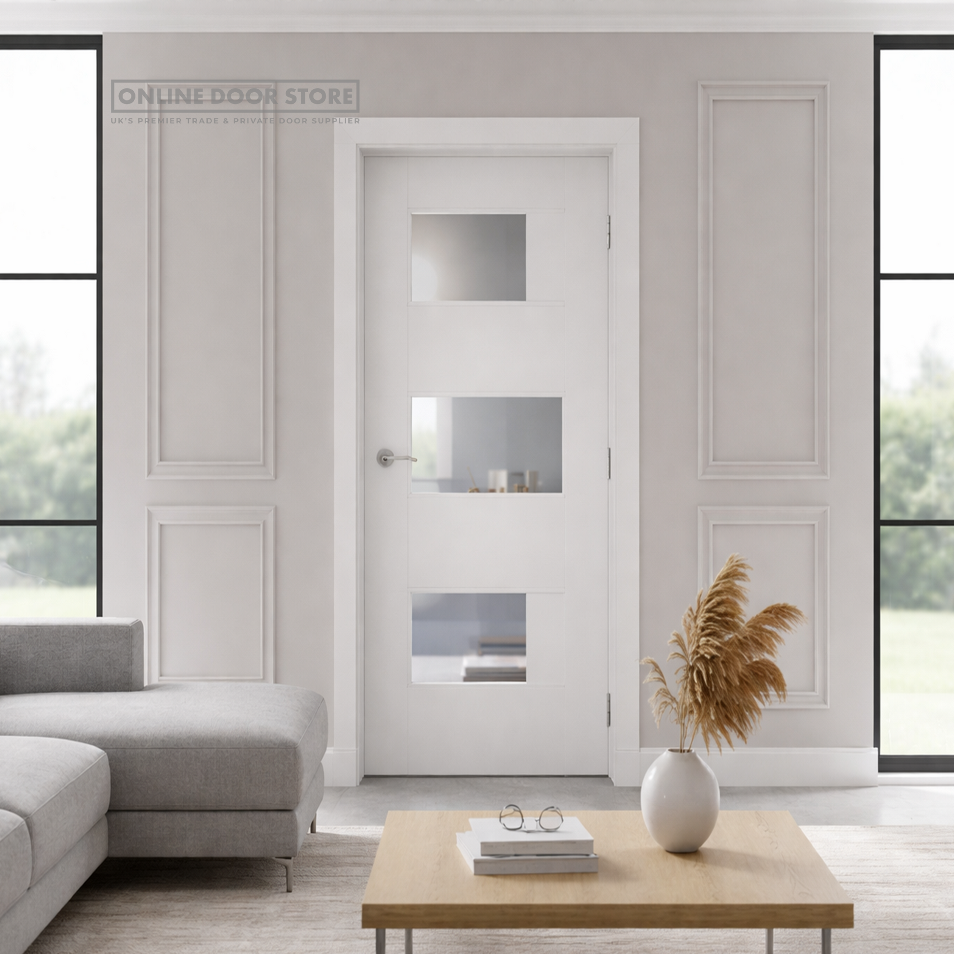 Discover the XL Joinery Perugia Finished White Clear Internal Glazed Door - engineered for strength, featuring toughened safety glass and a stunning design.